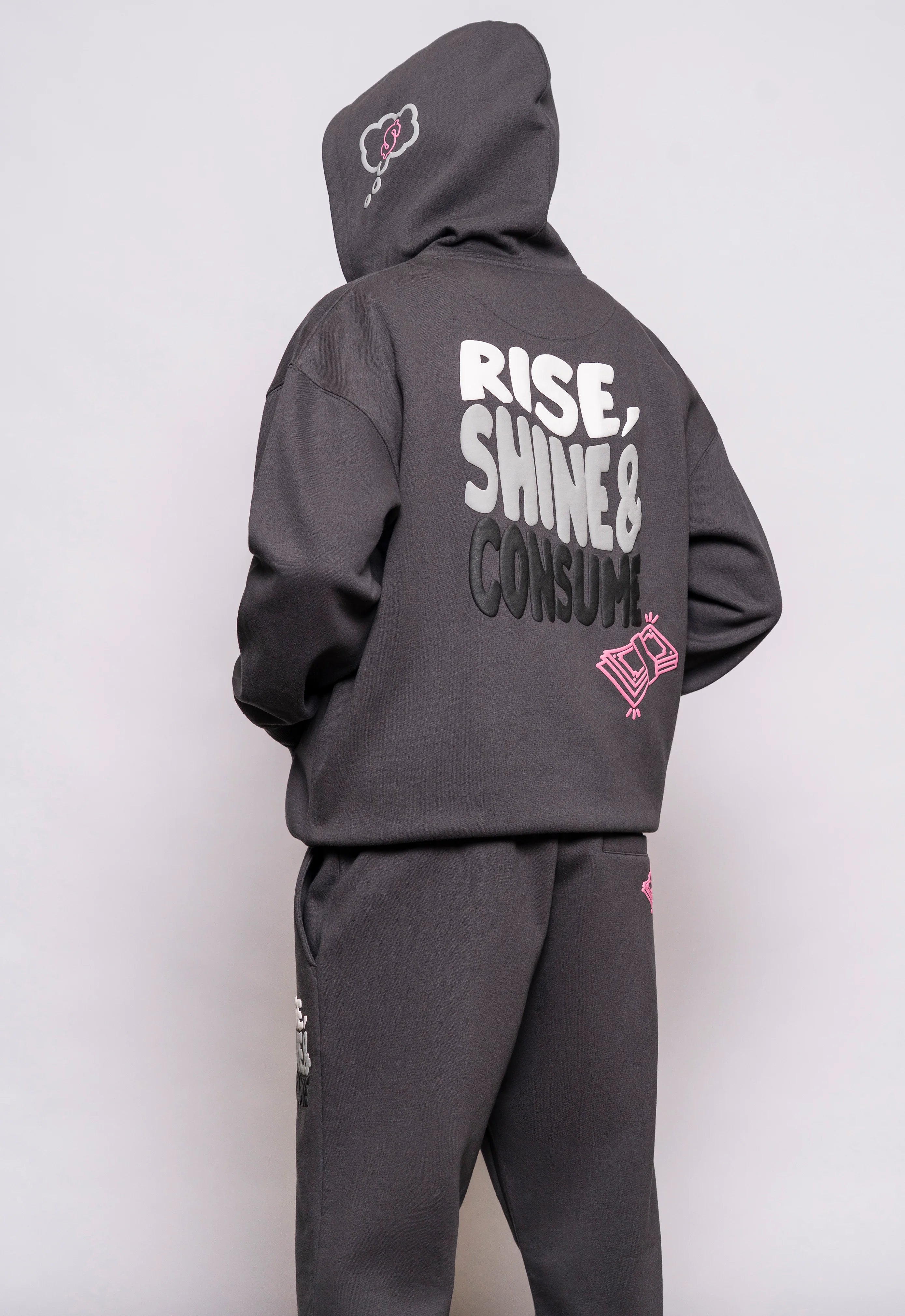 Midweight mischief. Puff print hits front, back, sleeve, hood. Charcoal tone = easy win. Pulls on smooth. Stays on longer than expected.