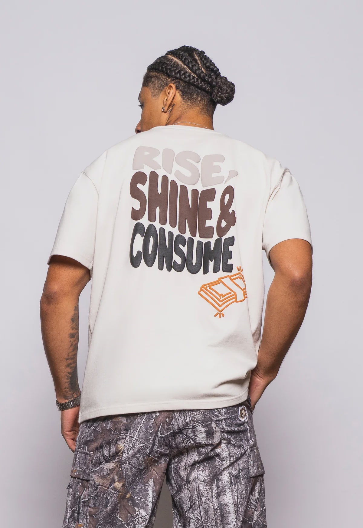Morning routine: wake up, spend money, repeat. Puff print tells the truth your bank account already knows. Oversized fit. Smooth cotton. Late-stage capitalism never looked this clean.
